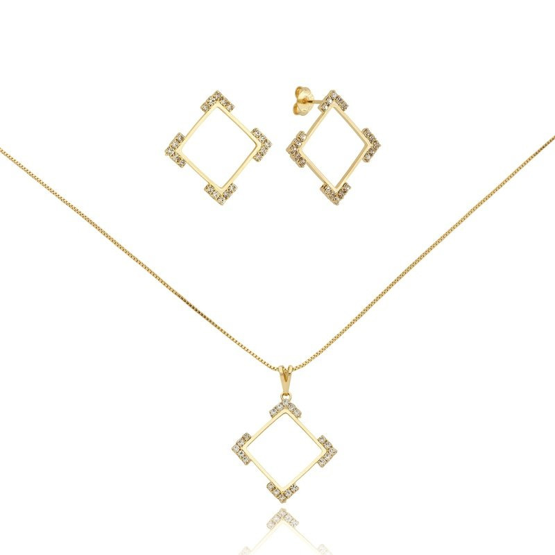 - Brinco e pingente no formato de quadrado de 1,7 cm com strass;
