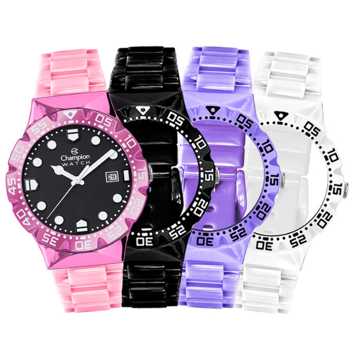 O Champion Troca Pulseiras vem com uma caixa metálica de 42mm e 4 pulseiras de plástico em cores incríveis, para você variar e combinar com qualquer look e ocasião.