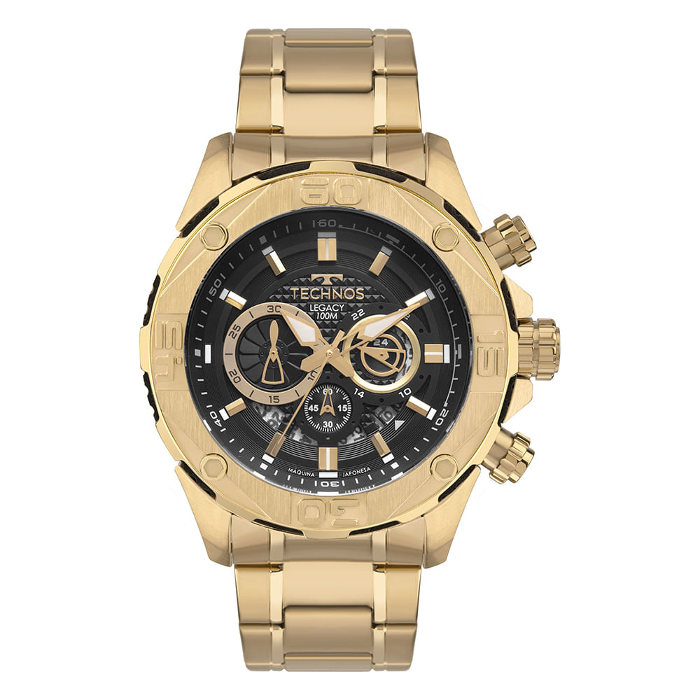 Relógio Technos Legacy com aro externo trabalhado em relevos e detalhes de parafuso. Sua caixa robusta conta com a aplicação de silicone em relevos nas laterais. Seu mostrador apresenta duas camadas, efeito de profundidade, aplicação de textura e assinatura de linha. Produto 100% em aço inoxidável, com máquina quartz japonesa Miyota, cronógrafo, calendário e resistência à água de 100 metros.